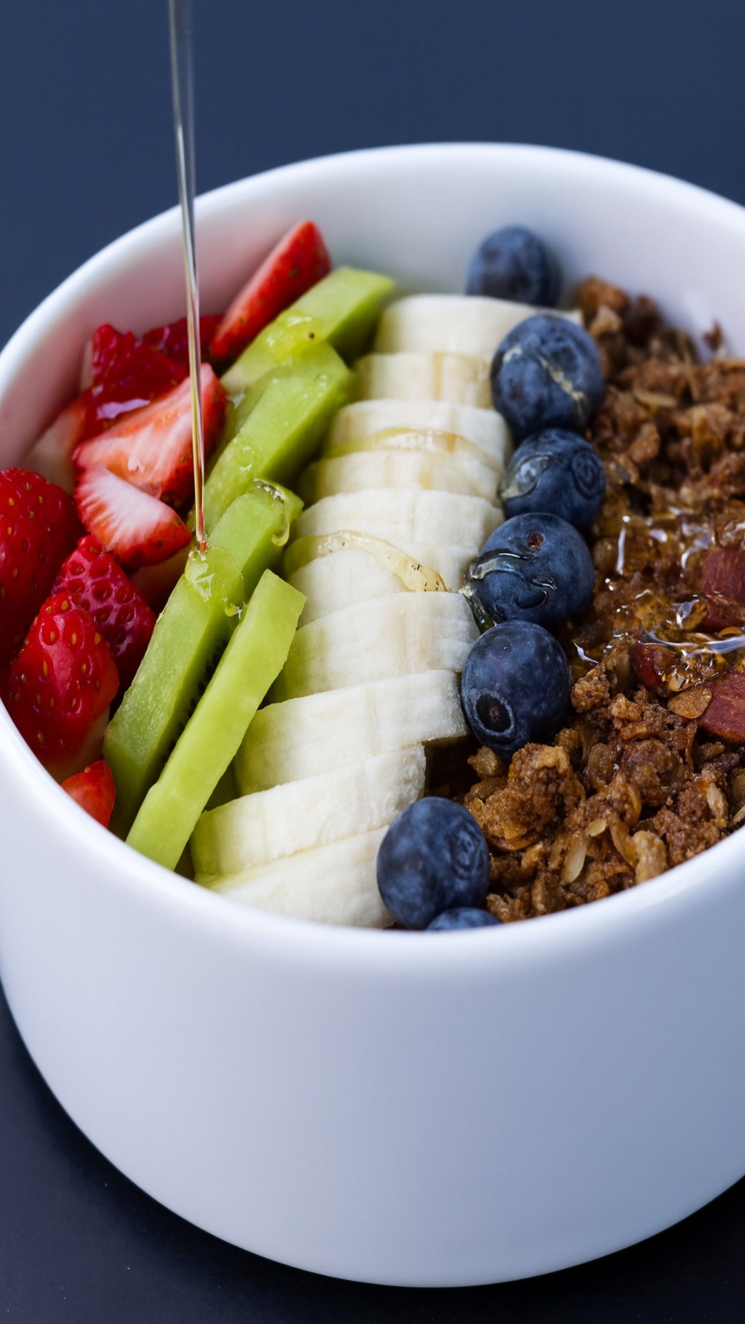 Yogur natural cremoso, granola casera crocante y frutas frescas de estación.